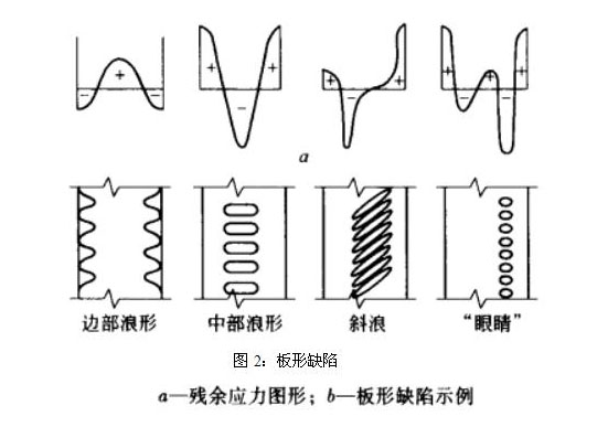 常见的板形缺陷有镰刀弯、浪形和瓢曲。浪形和瓢曲缺陷尚有几种形式(图3),其中“眼睛”属于比较特殊的浪形缺陷;较常见的是中部浪形与单侧或双侧边浪。对于所有板带钢产品来说,都不允许有明显的浪形与瓢曲,在产品技术标准中有具体规定。